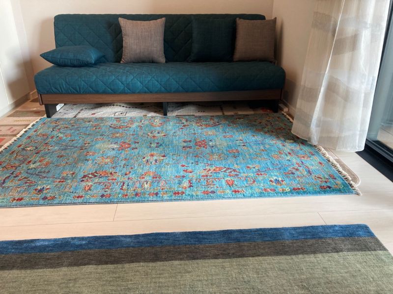 ハグみじゅうたんはとても踏み心地が良くて気持ちよく気に入っています。 ソファの方にもハグみじゅうたんのオーダーでブルーを選ぼうと再度お店に 行きましたが、少し雰囲気を変えるのも良いかと思い、今回はガズニンを選びました。 鮮やかなブルーの色合いがとてもきれいで気に入っています。